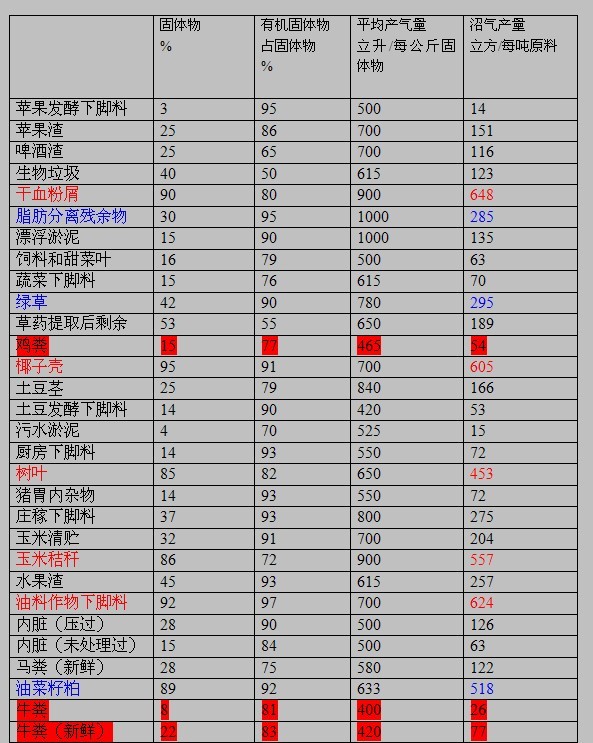 沼氣工程各種原材料產(chǎn)氣效果分析表